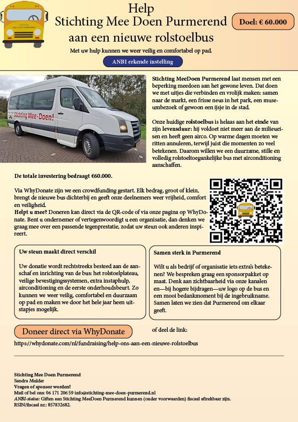 Deze uitstapjes zijn van groot belang, want ze brengen vreugde en gezelligheid naar de levens van velen. Met een nieuwe, duurzame bus kunnen we onze activiteiten uitbreiden en nog meer mensen de kans bieden om samen te genieten van onvergetelijke momenten.